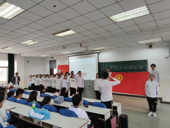 在阶102举行“三证”颁发仪式,院团委书记邢维迢老师和学生第二党支部副书记朱玲老师到场参加,全体大一新生参会。