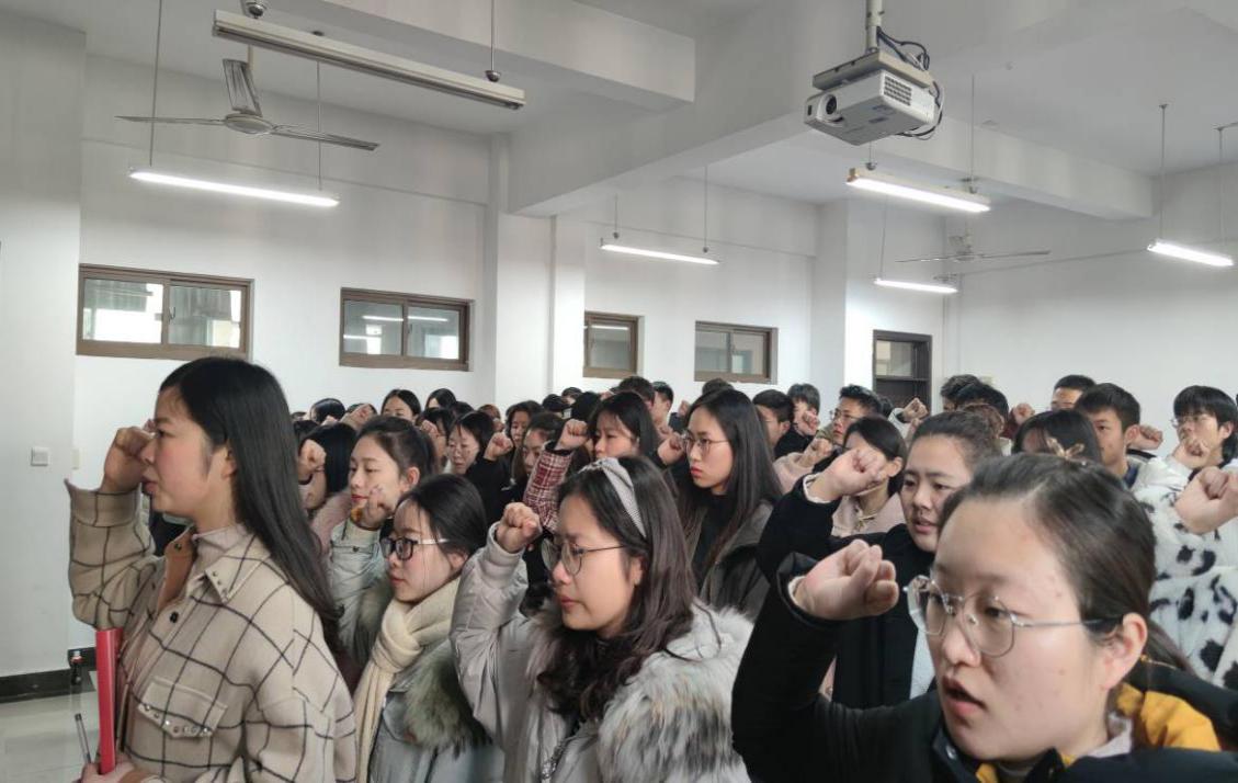 举行2020年下半年新发展学生党员入党宣誓活动。院党委书记胡卫东、院团委书记邢维迢、学生第一党支部书记袁磊、学生第二党支部书记产兵华、学生第二党支部副书记朱玲、辅导员妮萨参加了宣誓活动,并现场为预备党员佩戴党员徽章。