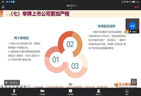 讲座中,徐经理介绍了新证券法修订的历程、要点、对市场的影响等相关问题,他回顾了证券法四次修订的历程,指出新证券法对于完善信息披露制度、保护投资者和违规监管具有重要意义。最后,徐经理与同学们进行线上互动答疑,做相关知识问答。整个讲座语言诙谐幽默,内容精彩纷呈,案例生动有趣,同学们积极参与,受益良多。