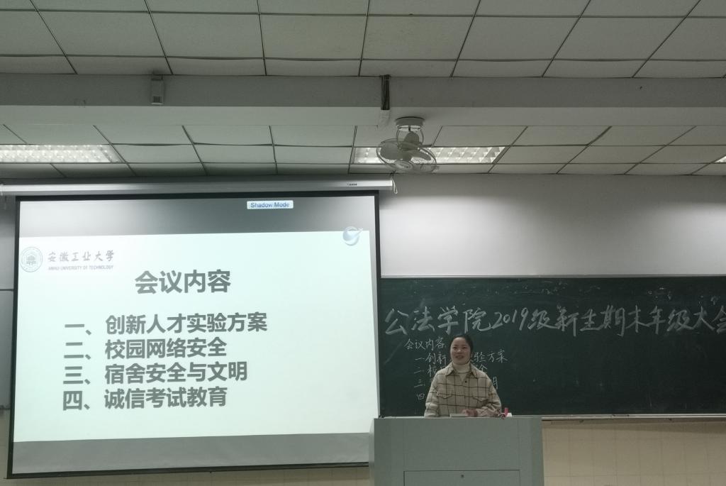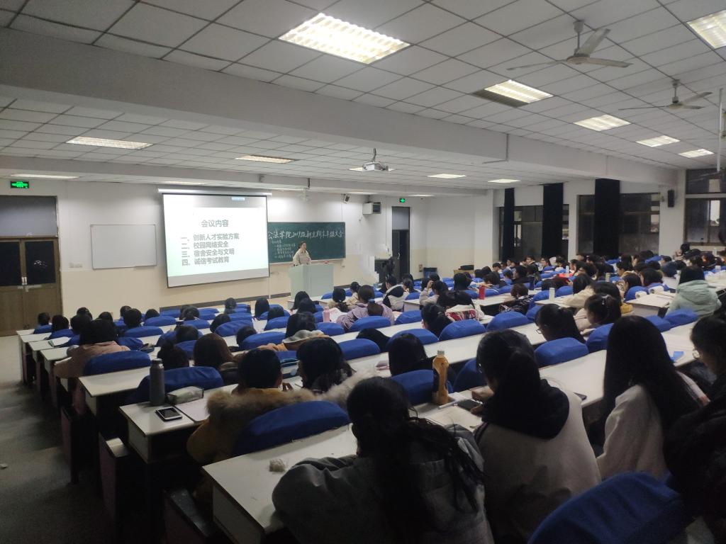 于东校区阶教102举办了新生期末年级大会。大会由19级辅导员朱玲主持,19级全体学生参加。