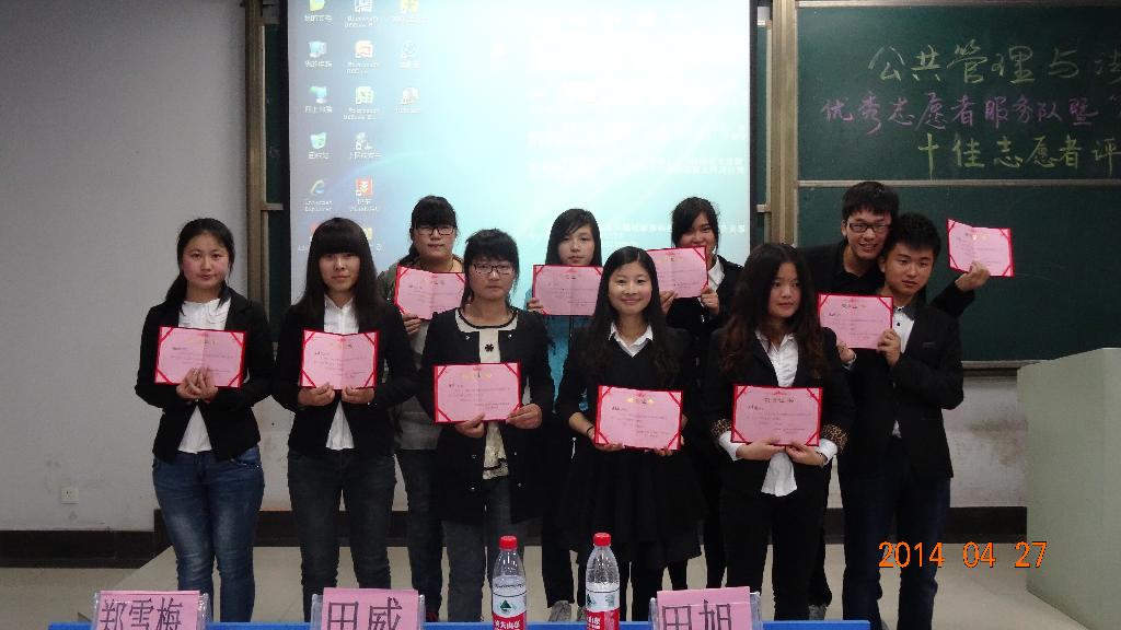 志愿者协会会长余永东肯定了各志愿服务队一年以来的工作成绩,同时要求各班进一步制定志愿服务工作规划,并加强活动宣传力度,为院志愿工作再创辉煌作出贡献。最终,行政132、事管131、法学132获得“优秀志愿服务队伍”荣誉称号。