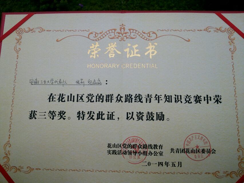 行政131班张莉和法学132班鲍磊磊组队参加了由花山区团委举办的党的群众路线青年知识竞赛暨五四表彰活动。
